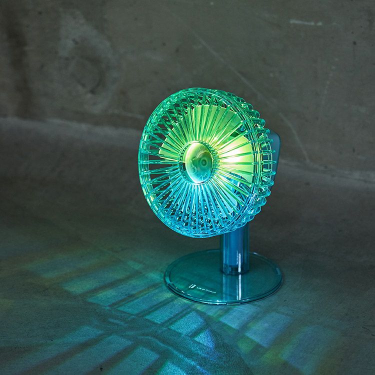 お部屋をポップに彩るクリア素材のデスクファンが登場。左右自動首振り機能に加え上下手動調節ができ、広範囲に送風が可能です。自動で7色に切り替わって光るポップなLEDライトを搭載し、昼と夜とで違った楽しさをお部屋にプラスしてくれます。充電式のため屋外での利用も可能で、アウトドアやフェスでも活躍。フォトジェニックなアイテムです。