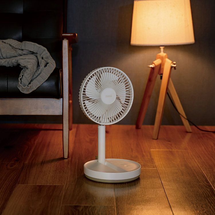 リビングファンの機能をそのままに、コードレスにしたことで使い方や使用場所の幅がグッと広くなった全く新しいリビングファンです。折りたたみ式だからさらに持ち運びや収納が便利に。十分な風量と、リズム・自動首振り運転機能、上向き約90°の角度調節が可能な賢く便利な優れもの。風から快適な毎日を提案する1台です。