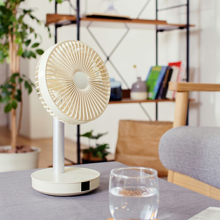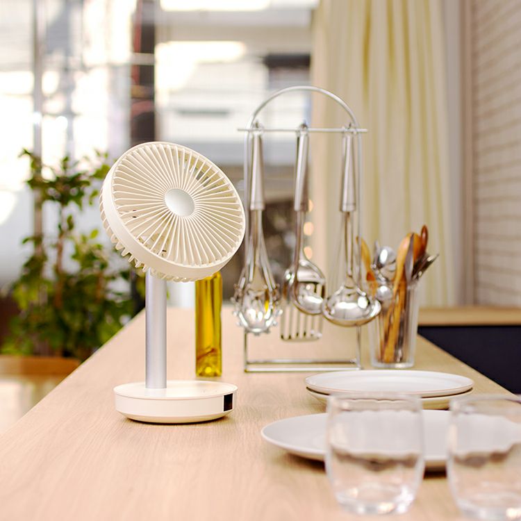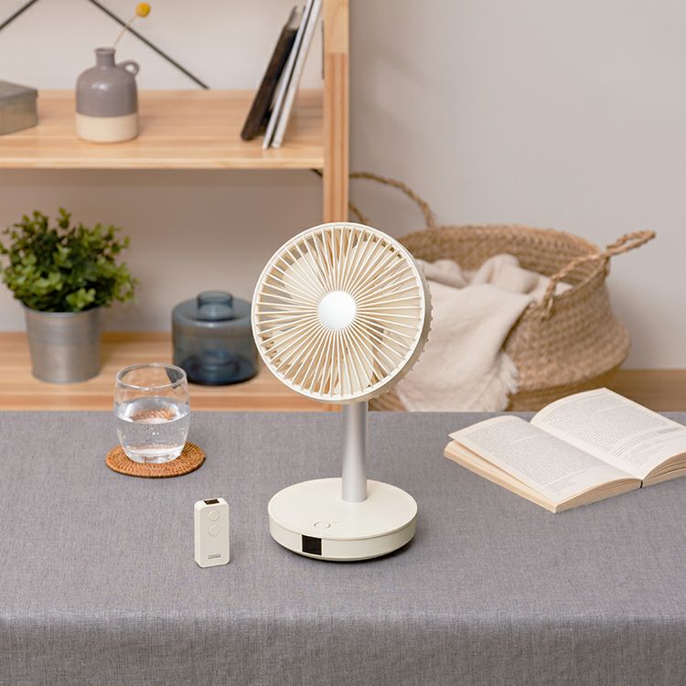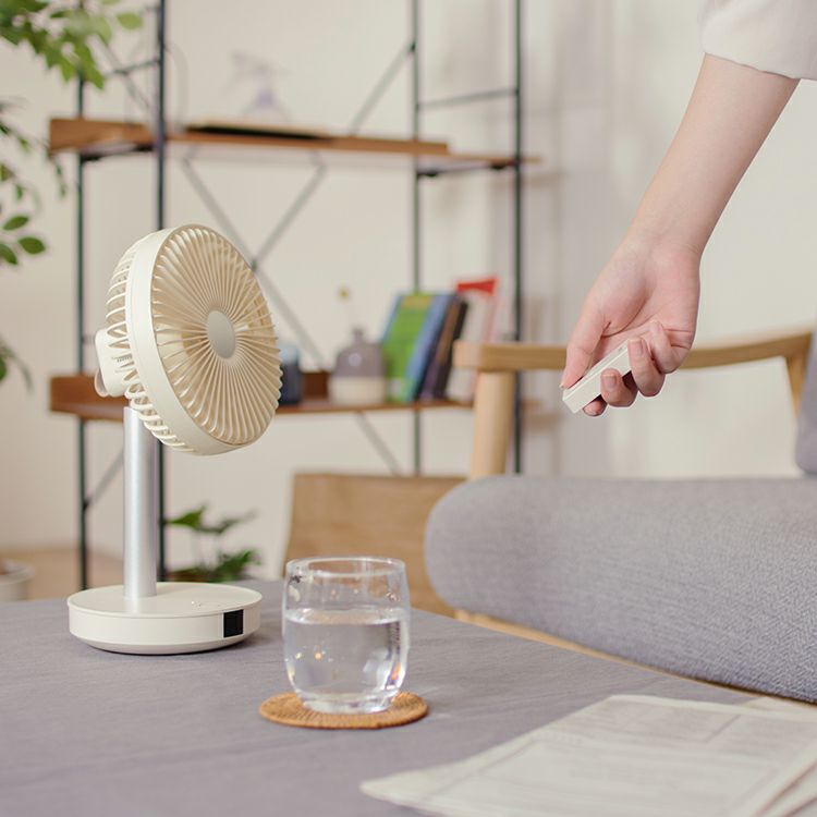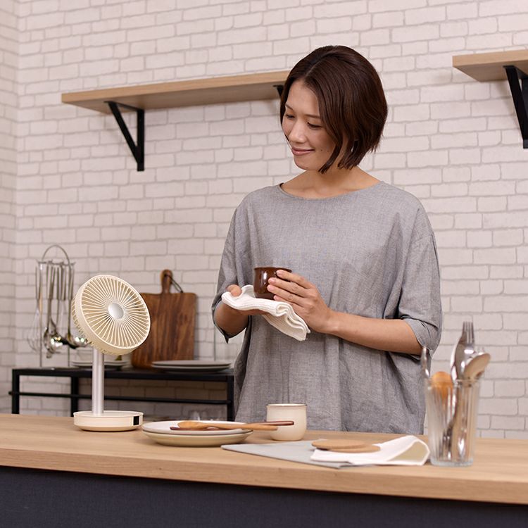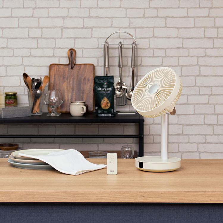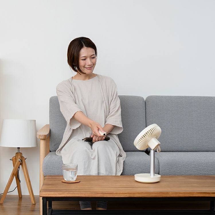 リビングファンの機能をそのままにサイズを小さく、さらに充電式にしたことで使い方や使用場所の幅がグッと広くなった全く新しいリビングファン。リモコンでの操作がより快適な使用感を実現しました。小さくても十分な風量と、リズム・自動首振り運転機能、上下合計約95°の角度調節が可能な賢く便利な優れもの。モバイルバッテリー機能は非常時にも役立ちます。プライベートスペースなどでは空気を循環させるサーキュレーターとしても1年中ご利用いただける、風から快適な毎日を提案する1台です。