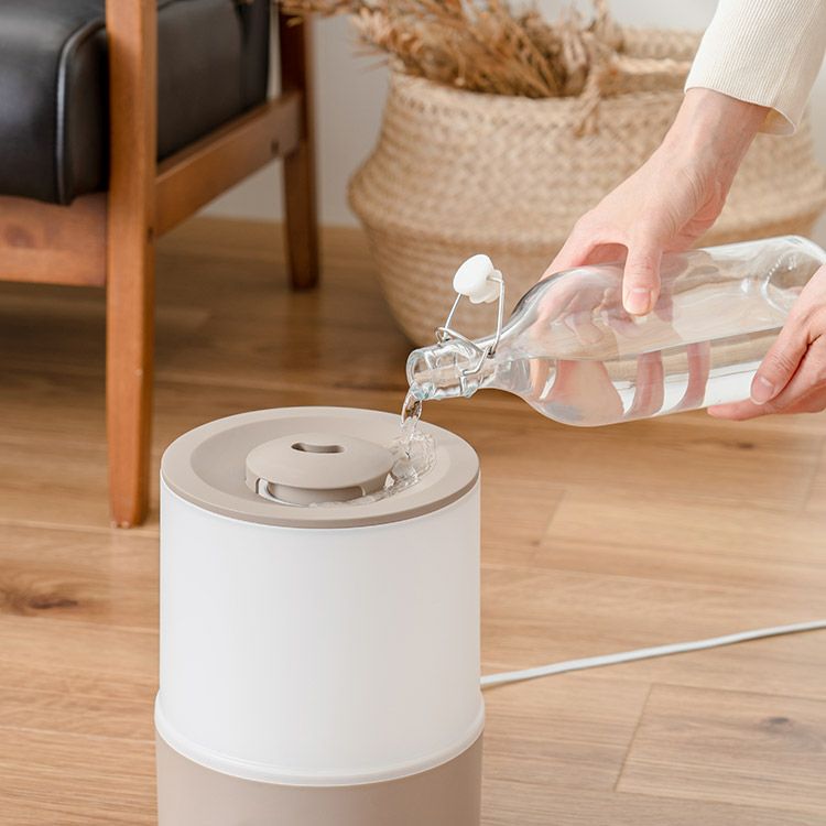 フタを外さず上部から楽に給水できる超音波式加湿器。さらに加湿量の無段階調整が可能です。お好みのアロマを楽しめる他、暗い場所で優しく光るライト機能も搭載。秋冬の暮らしに優しく寄り添います。