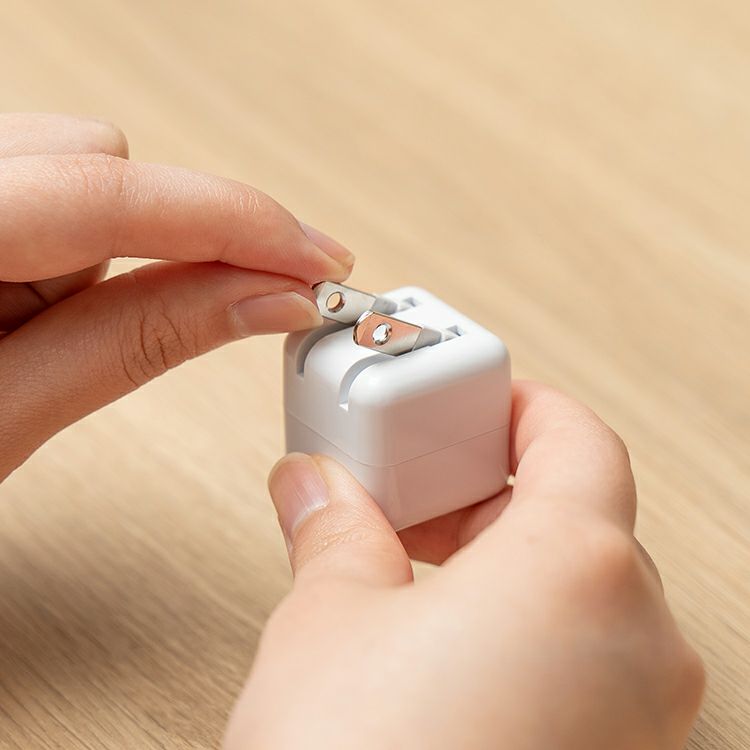 USBコードに繋げて充電する製品に使えるACアダプターです。他のコンセントに干渉しにくいコロンとした小さなキューブ型。もしもの危険を防ぐため、安全性にもこだわりました。プラグを格納すれば持ち歩きにだってぴったり。小さいからこそ、いつでも頼れるアイテムです。