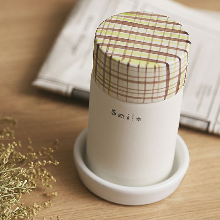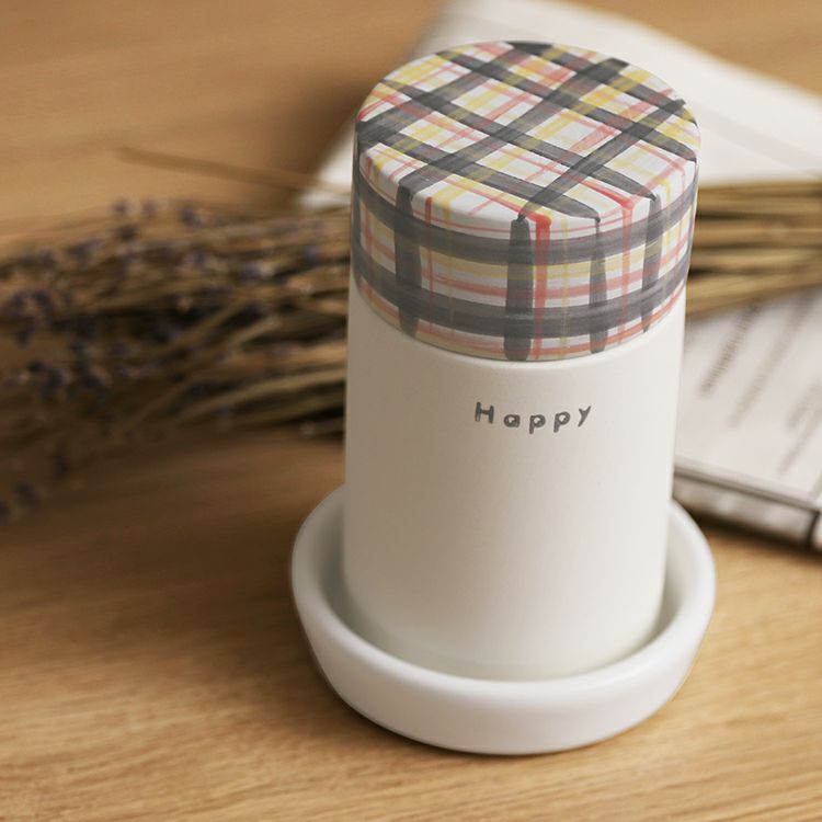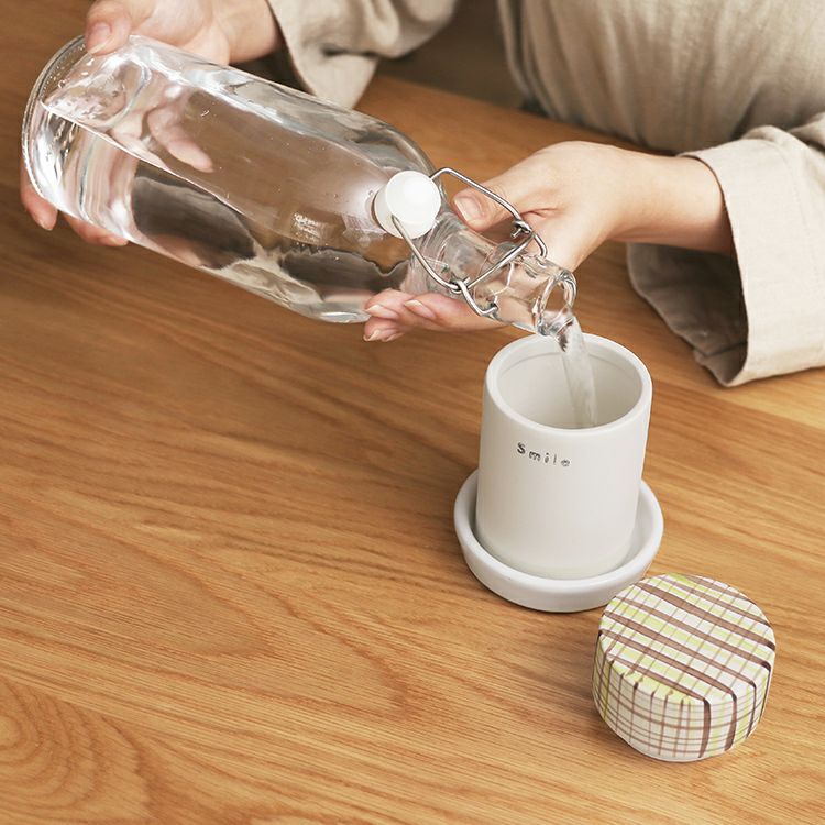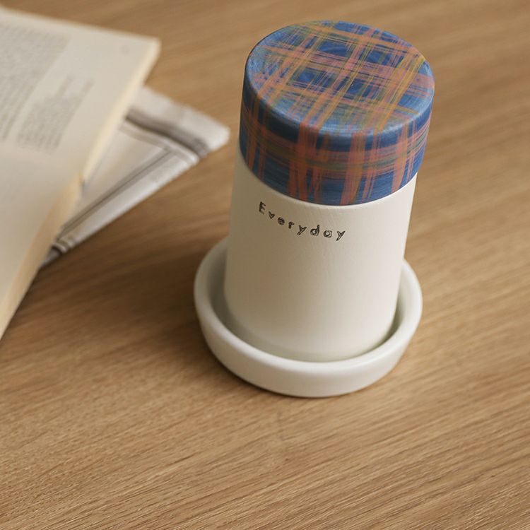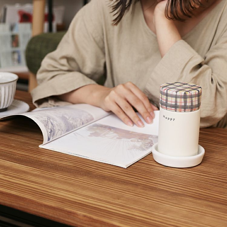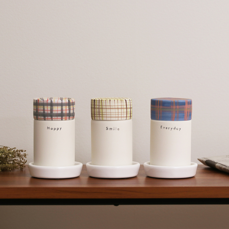 やさしい色合いのチェック柄の蓋がちょこんと乗った可愛い陶器のカップ。中に水を注ぐと、ゆっくりと空気を潤してくれる加湿器に早変わり。電気を使用しないから環境にやさしく、面倒なお手入れも必要なし。3つのカラーからお部屋にぴったりな1つをどうぞ。