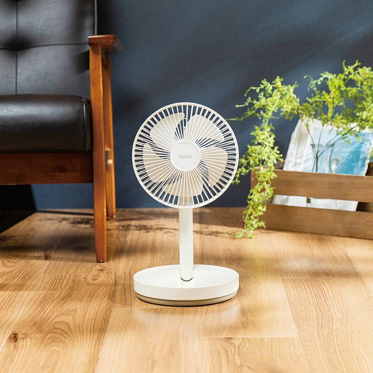 リビングファンの機能をそのままに、コードレスにしたことで使い方や使用場所の幅がグッと広くなった全く新しいリビングファンです。折りたたみ式だからさらに持ち運びや収納が便利に。十分な風量と、リズム・自動首振り運転機能、上向き約90°の角度調節が可能な賢く便利な優れもの。風から快適な毎日を提案する1台です。