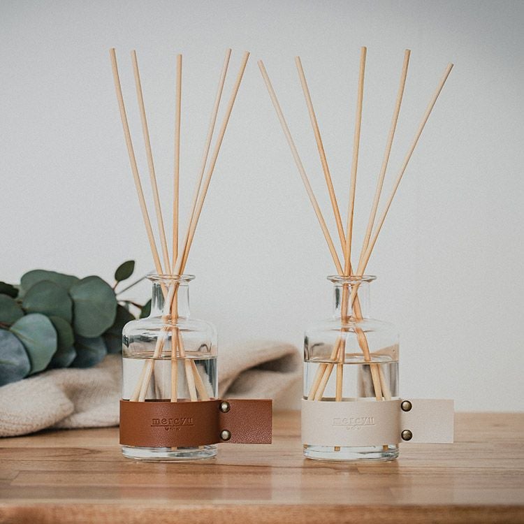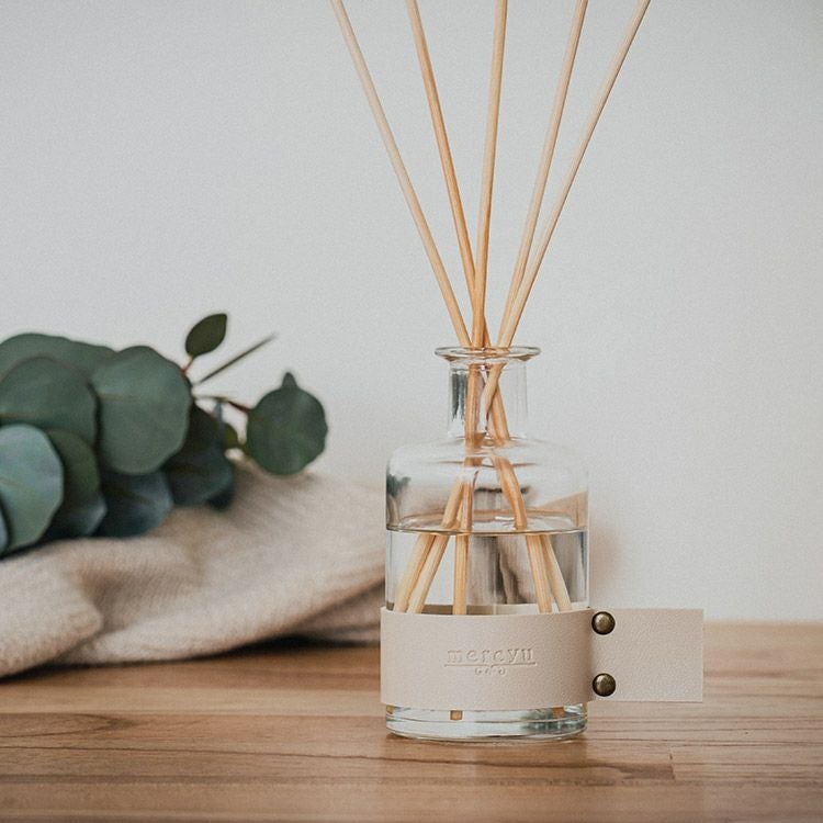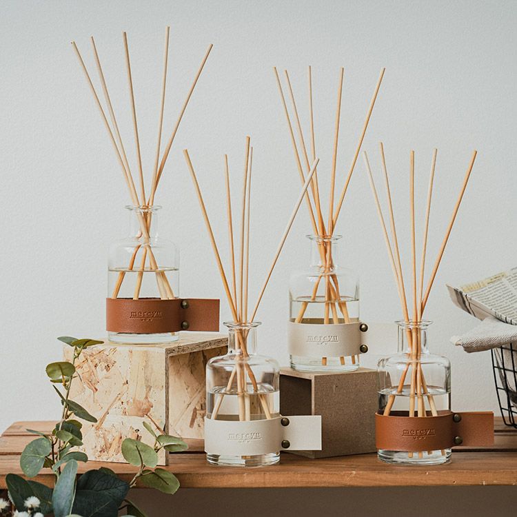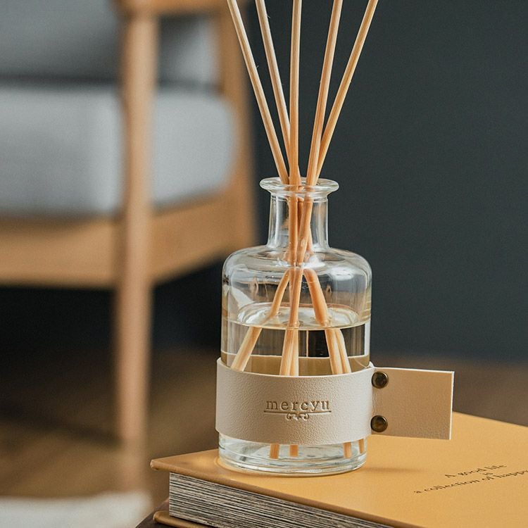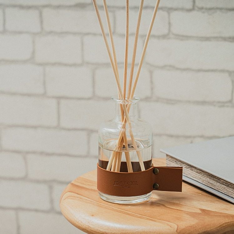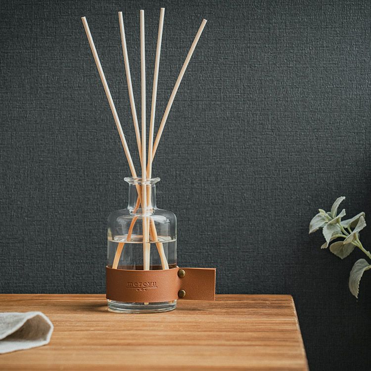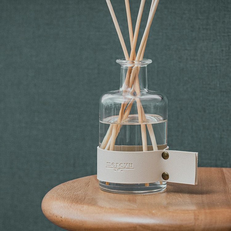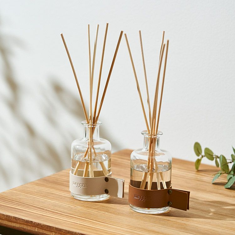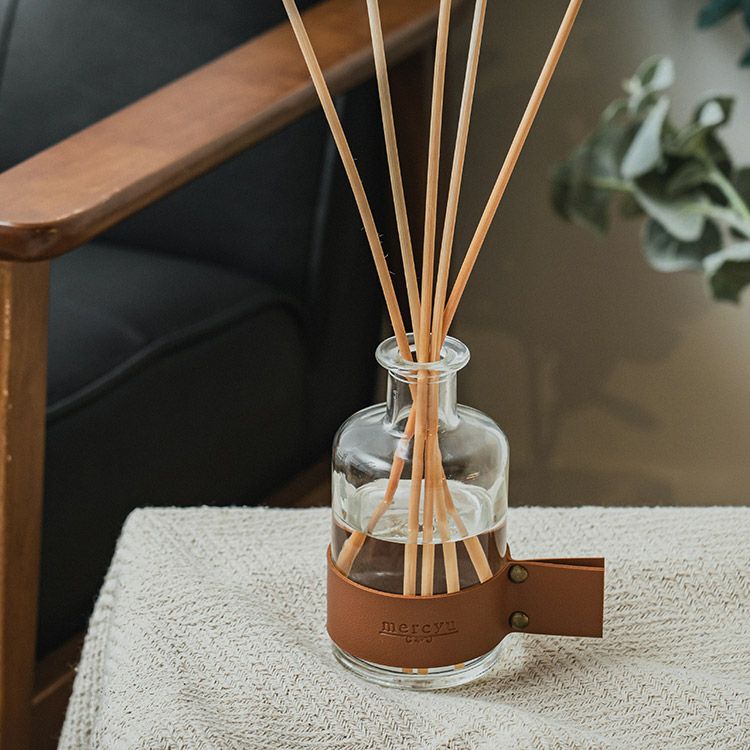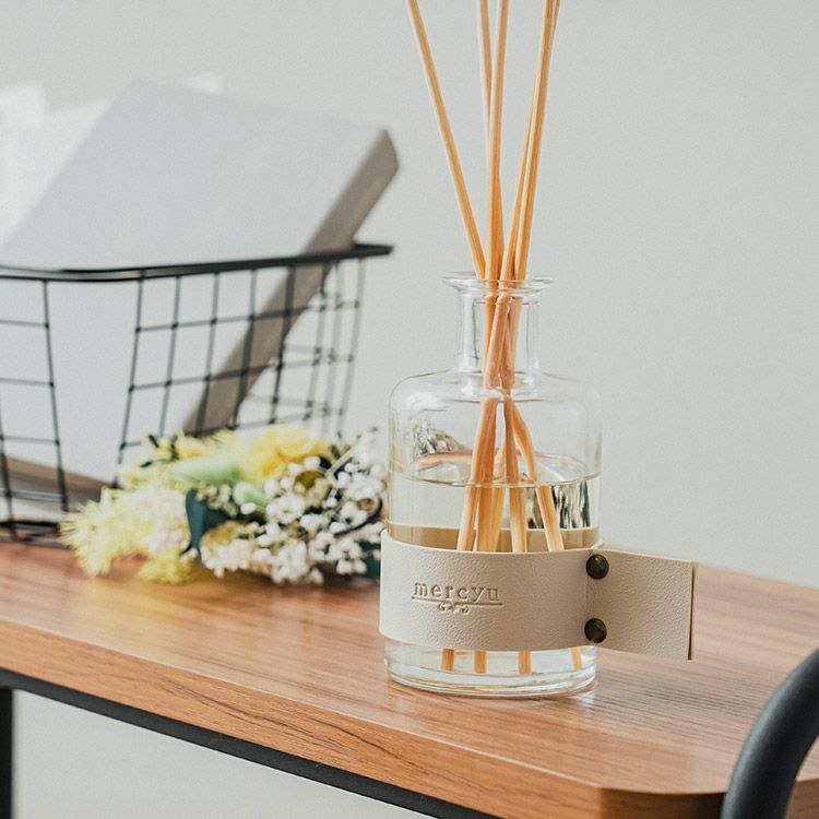 リードディフューザーのガラスボトルにレザー調ベルトをあしらった、スマートなデザインが魅力。ベルトのカラーは、インテリアに馴染みやすいベージュとブラウンの2色展開で、インテリアのテイストや男女を問わずお選びいただける仕上がりに。香りはmercyuの人気の香りの中から、テイストの異なる4種を厳選。フルーティ系、フローラル系、アンバー系、ウッディー系の中からお好みの香りをお選びください。