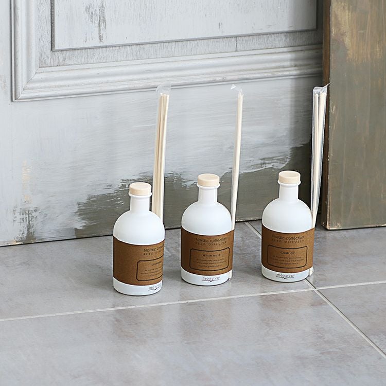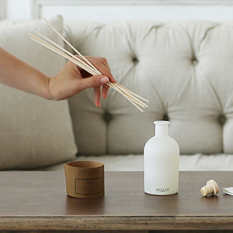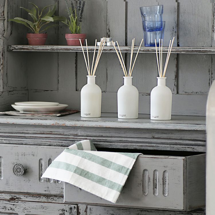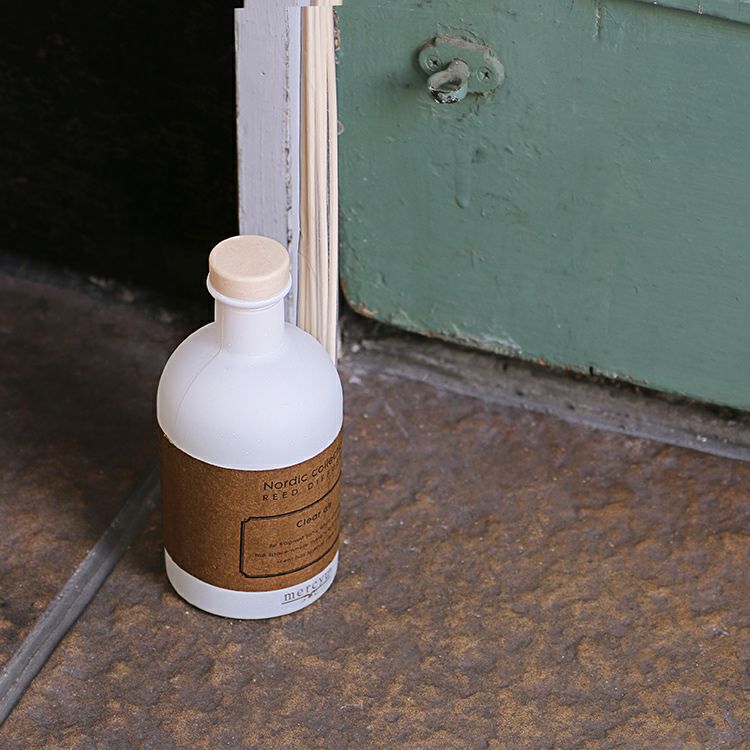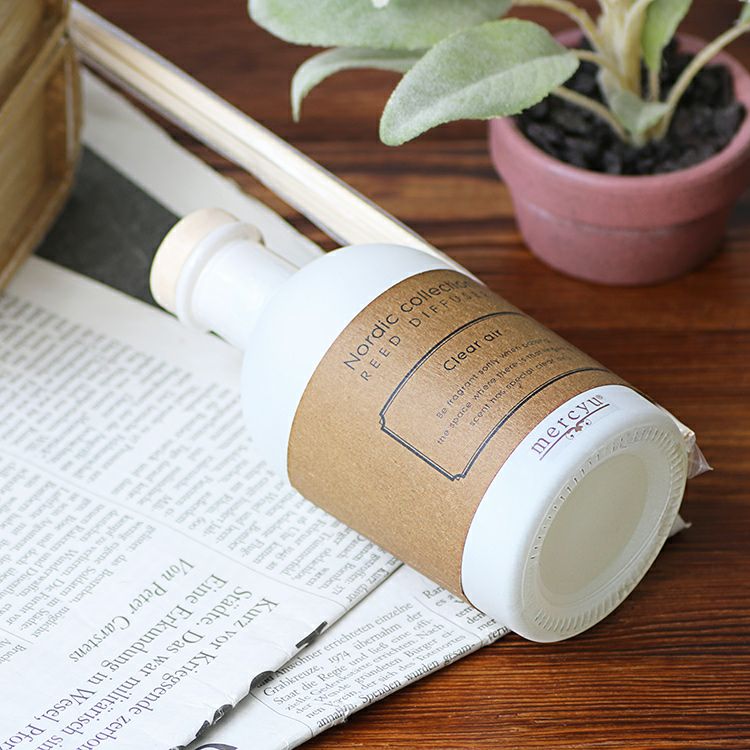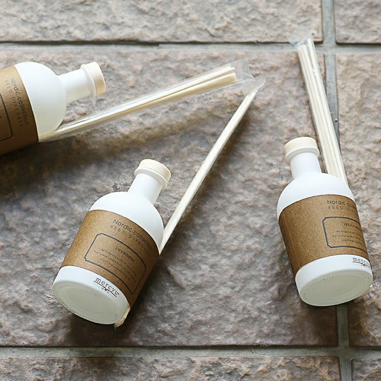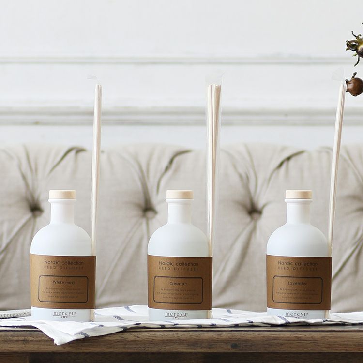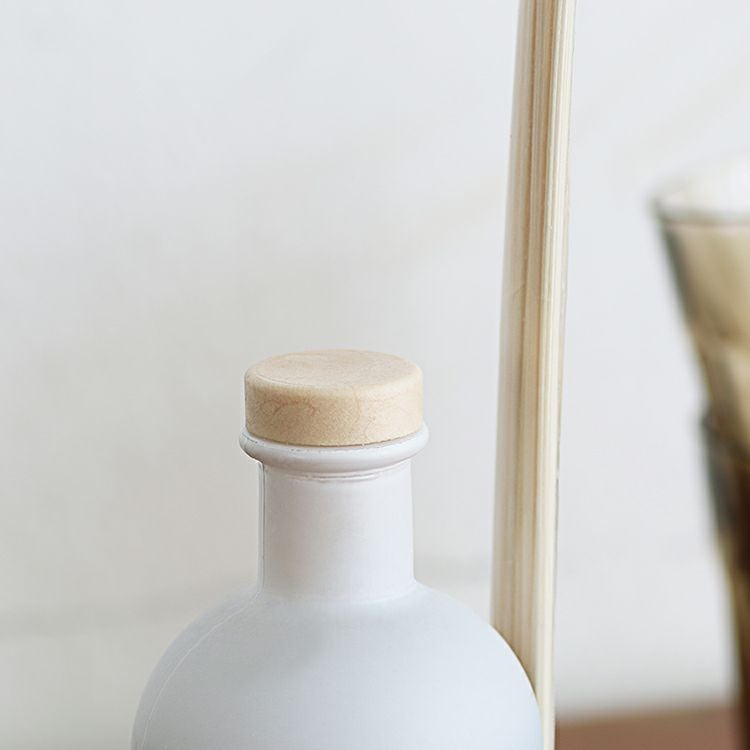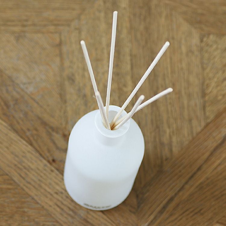 パッケージペーパーを外せば、シンプルなホワイトのガラスボトルに。シンプルに楽しんで欲しいからこそ、無理に飾らないリードディフューザーです。