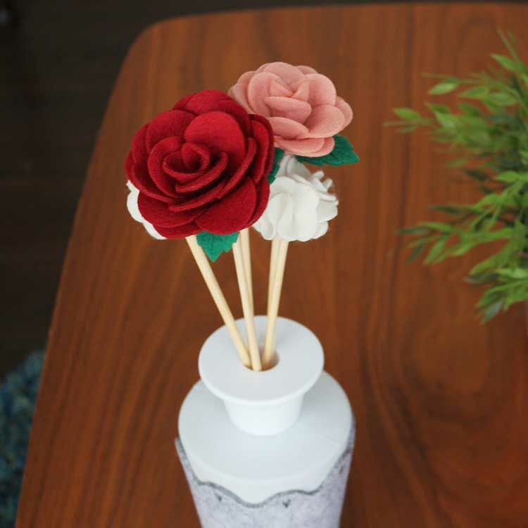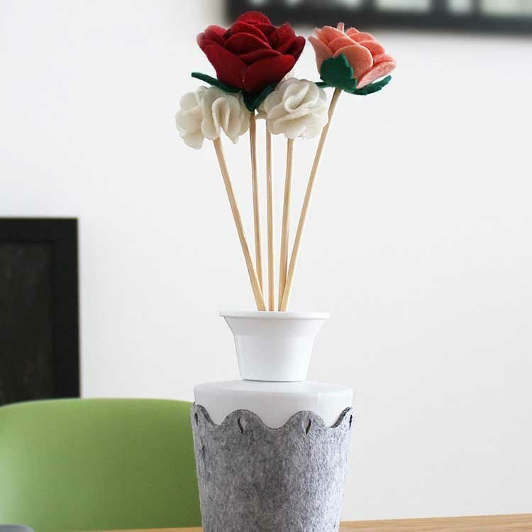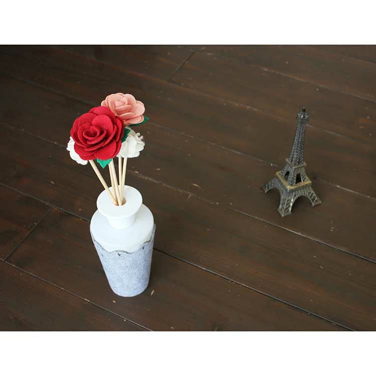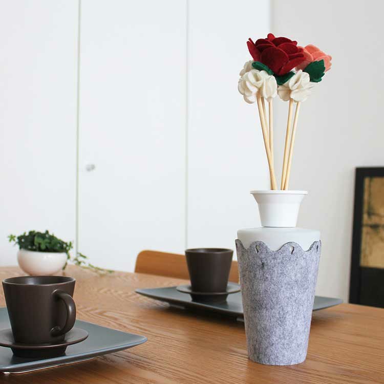 フェルトの生地を使ったリードディフューザーはシンプルでいながらもお部屋を彩るNordicがコンセプト。やさしい質感のグラスにフェルトのカバーをプラス。シンプル且つぬくもりあるボトルはお部屋の中に溶け込みます。リードの先に咲いているフェルトフラワーは、1本1本手作りし、ハンドメイドならではのぬくもりをお届けします。また、鮮やなお花はお部屋を明るく彩ります。やわらかなフェルトのぬくもりと、Clear Airの甘く心地の良い香りで、ゆったりとしたひとときをお過ごしください。