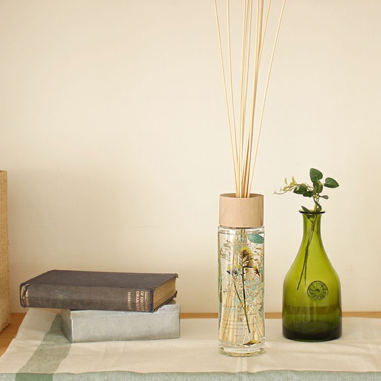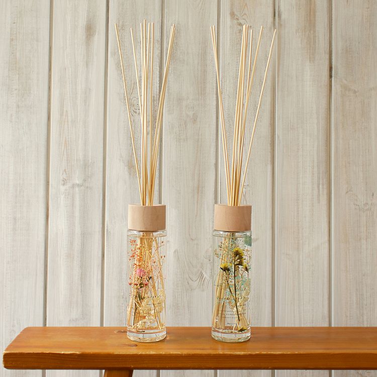 ナチュラルなラタンリードとウッドキャップがお花たちと調和し、癒しの空間を作り出します。こだわって選びぬいた2つの色と香り、きっとあなたのお気に入りの香りが見つかるはず。