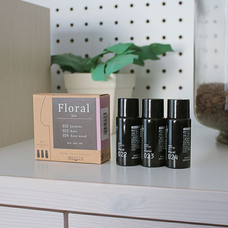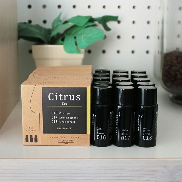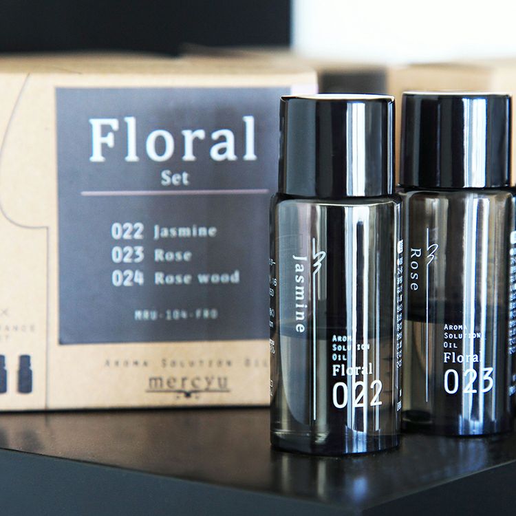 香りはシトラスセット・プラントセット・フローラルセット・フルーティーセット・リフレッシュセットの5種類をご用意。それぞれのセットには特徴ある同じ系統の香りを揃えています。