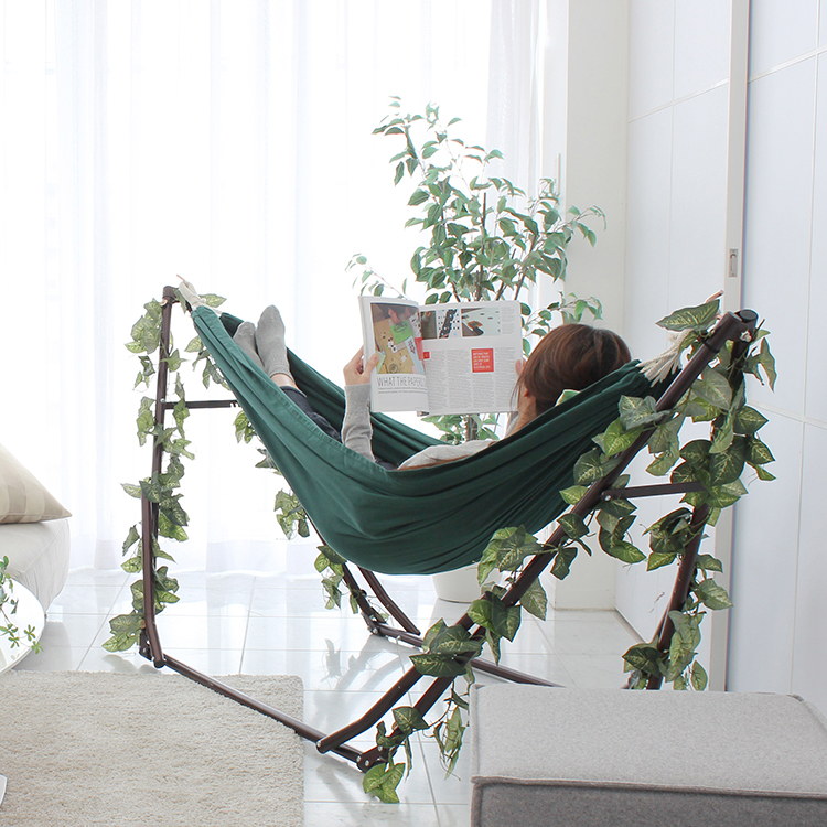 自然と共に生活するボタニカルなスタイル。木目調のハンモックのフレームが温もりと高級感をお部屋に演出します。フレームのアームを広げるとハンモック、狭めて生地を変えるとチェア、ハンガーロッドを付け変えればハンガーラックとしてご使用いただける3WAYスタイル。ガーデン感覚を味わえる蔦(つた)も付属しています。あなたの気分、生活観、シーンに合わせてガーデンハンモックと共に新たな生活をお楽しみください。