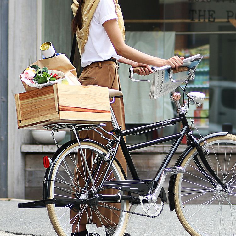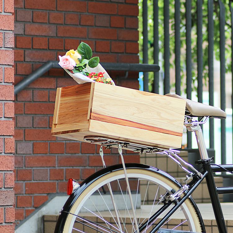 荷台に取り付けられた木カゴは自転車のワンポイントに。木カゴと自転車の組み合わせをお楽しみください。