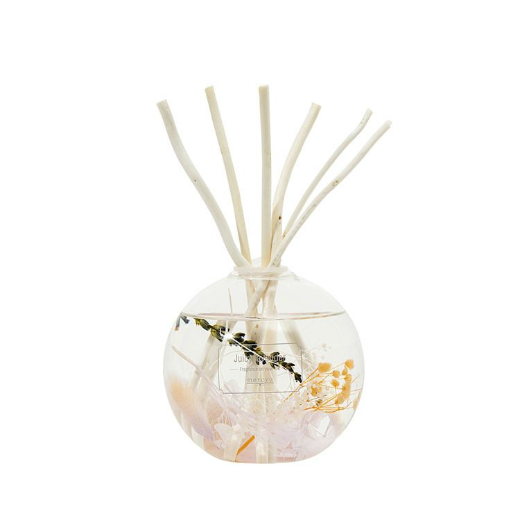 ころんと丸いボトルは可愛らしさ満点。どの角度からでもお花の美しさを楽しめるハーバリウムディフューザーです。純白の柳のリードが目に鮮やか。夏のフレッシュなラベンダーの香りと、爽やかなカラーが魅力的です。