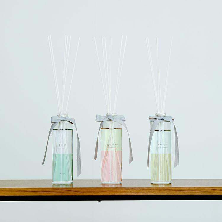 リボンが結ばれたまるで香水瓶のように可愛らしい小瓶からは、お部屋いっぱいに広がる心地良く優しい香りが。洗い立てのリネンのように柔らかなJasmine lily、穏やかさと爽やかさを持ったOcean、すっと気持ちを立て、明るく元気にしてくれるOrange、3つの香りからあなたにぴったりなひとつをどうぞ。