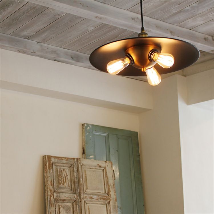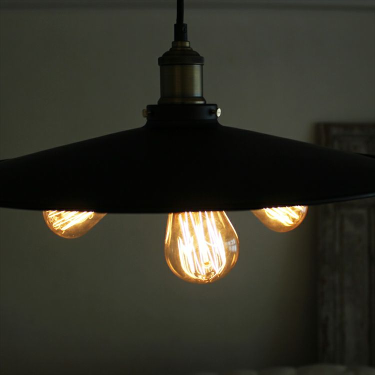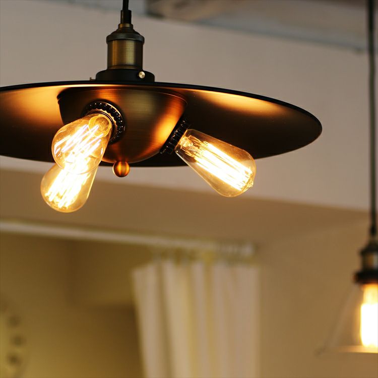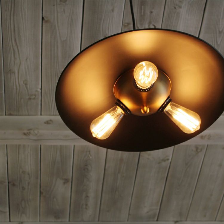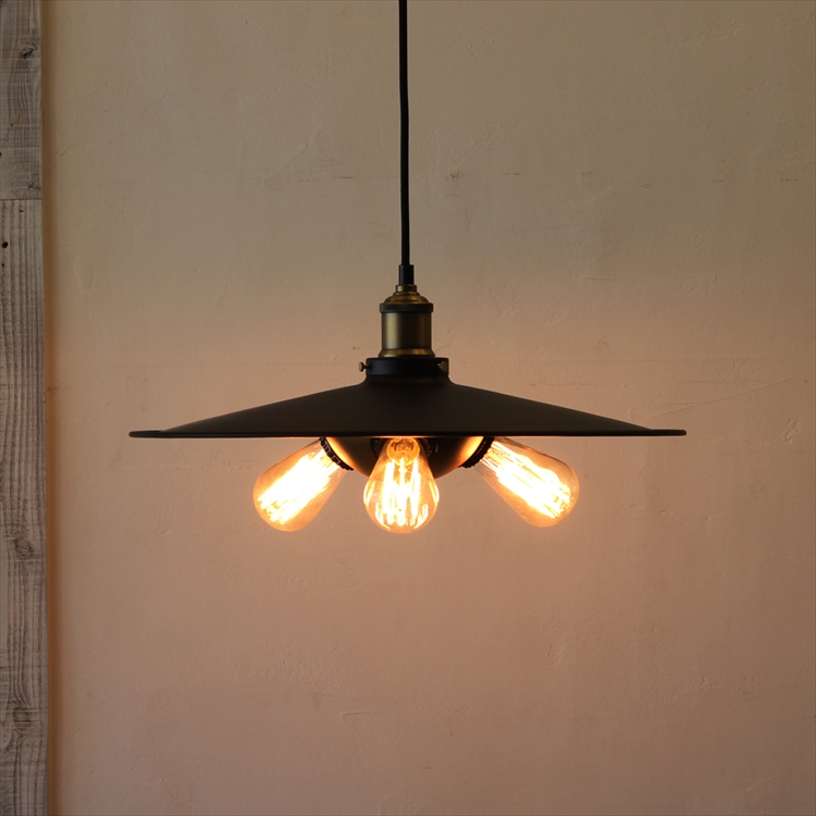オレンジ色に光る3灯のエジソン電球と存在感のある渋いシェードがその場を優しく包み込みます。どこか懐かしくて優しい光に包まれて贅沢なひと時をお楽しみください。