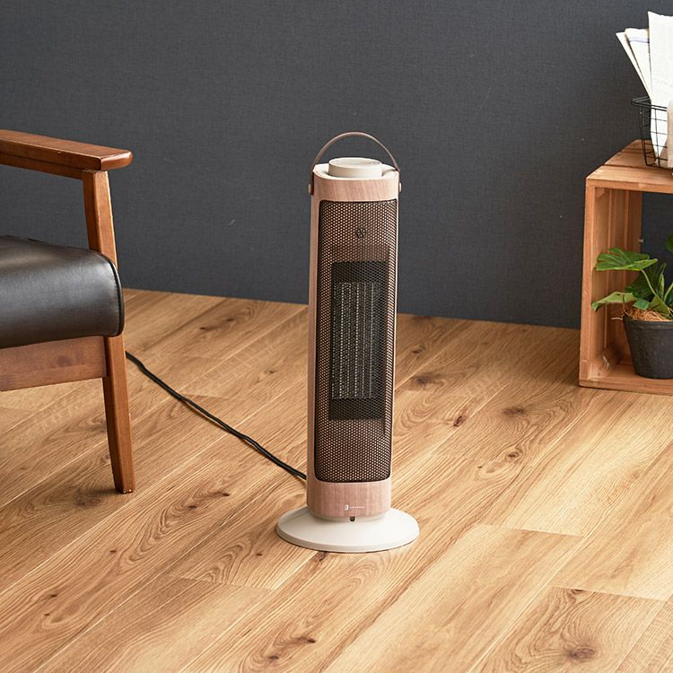 木目柄とレザー調ハンドルがおしゃれな、見せ置きできるヒーター。リアルウッドを彷彿させる美しい木目柄は、高精細な意匠表現技術をもつ大日本印刷株式会社との協業で実現しました。自動首振り機能と1200Wのハイパワーで、お部屋をしっかり暖めます。送風モード搭載のため、春から初夏は室内の空気循環に利用するなど、通年使える点も魅力。インテリア性と機能性にこだわる方におすすめの1台です。