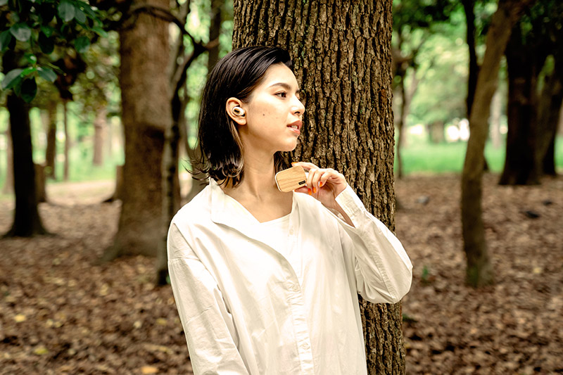 木のぬくもりを感じる、RERUU(レルー)のワイヤレスイヤホンです。