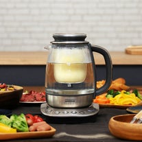 ティファールのを使っていたがそろそろ買い替えかなと思っていた時、次に購入の時は温度調整できるのがいいと幾つか見繕っていたのですが、そのどれも口が小さくて、ズボラ時にやっていたレトルトを突っ込んで温めることができないのですよ、ちょうどこちらの開発きっかけですね。 それで購入を見送っていたら、マクアケでコレを見かけて低温調理器具にも興味があったのでこれはイイと申込みました。 1度単位の温度設定はできないものの、調理に使うのは設定された温度帯しかほぼないしガラスで中の様子が見られるのは思いのほか楽しいです。 サラダチキンもおいしくできました。たまに作るスモークハムやベーコンの殺菌用加熱もできました。 茹で卵は殻が割れて白身が飛び散った時がイヤなのでカップを利用して茹でてみました。2個までならそれでも普通茹で上がりました。 ちょっとアタッチメントの口とガラスカップが小さく感じましたが、それより大きいものをどうしてもやりたいときは(自己責任で)アタッチメントを外したり、ガラスカップからのヒントでビニール袋を2重にしたりして対応できました。 意外なところで直接60度まで加熱のお湯は、湯たんぽにちょうどいいです。 フォンデュはまだやってませんが、チョコフォンデュ用の温度推移と時間を見て思ったこと、 「60度に一度上がらず40度維持6時間とかもあったらヨーグルトメーカーにもなったのにな」 これまであったら隙が無さすぎ調理器具ですね~。ともあれこれから試行錯誤が楽しみです。